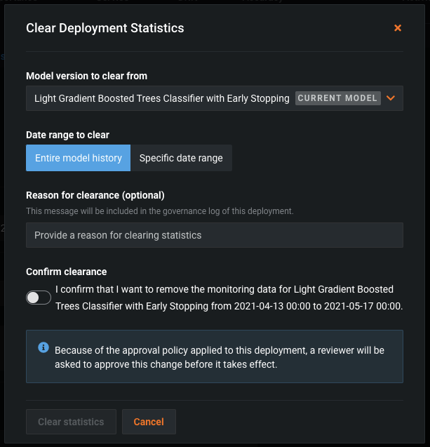 Deployments now support the deletion of monitoring data by model or time range. This action is governed by the approval workflow to safeguard against accidental deletion. This feature allows you to remove monitoring data sent inadvertently or during the integration testing phase of deploying a model from the deployment.