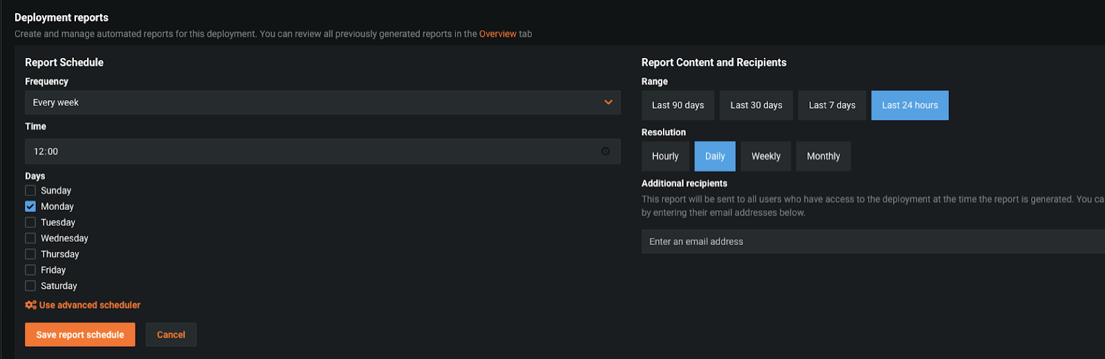 You can now generate a deployment report on-demand, detailing essential information about a deployment's status such as insights about service health, data drift, and accuracy statistic (among many other details). Additionally, you can create a report schedule that acts as a policy to automatically generate deployment reports based on the defined conditions (frequency, time, and day). When the policy is triggered, then a new report is generated and DataRobot sends an email notification to those who have access to the deployment.