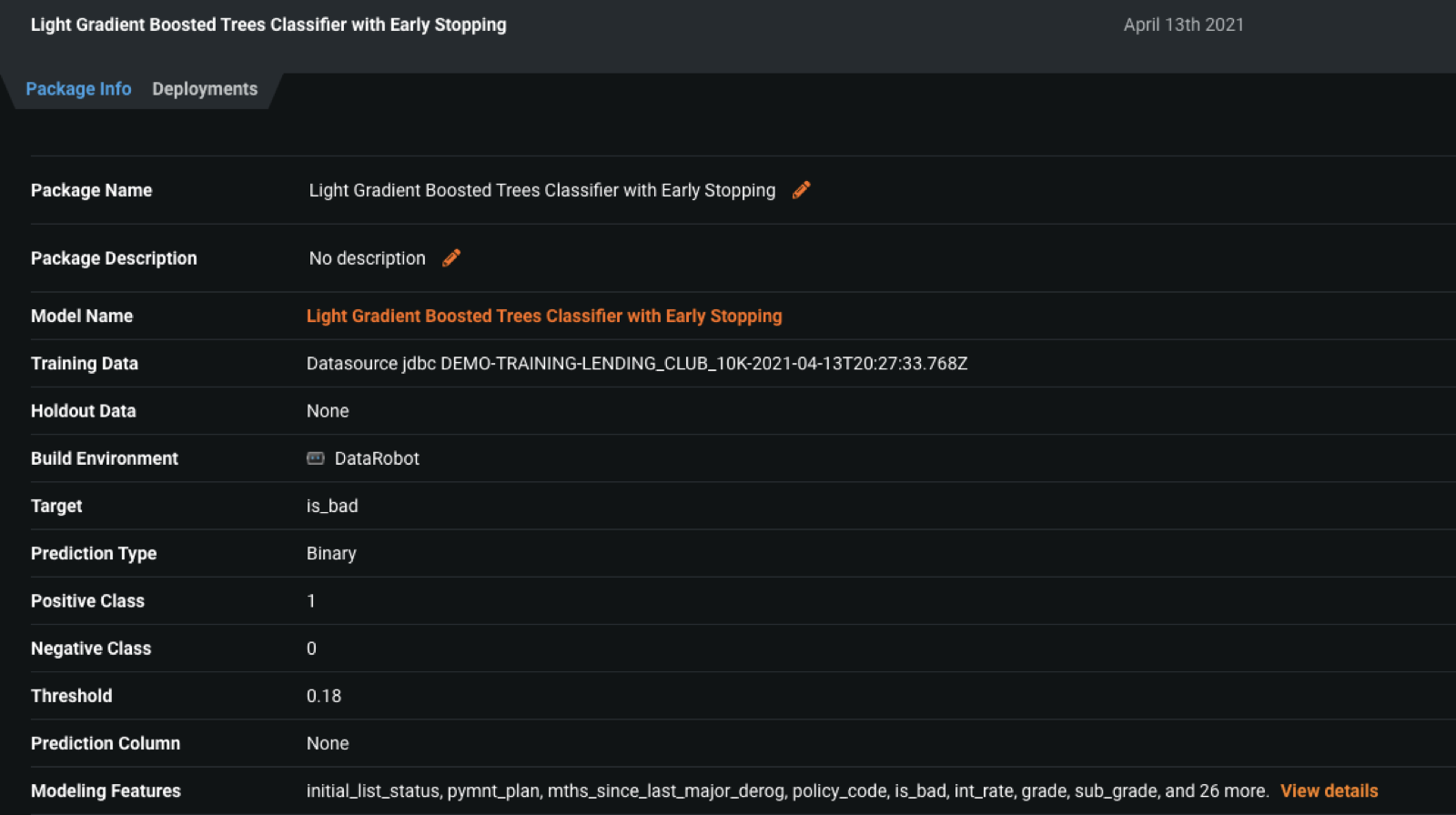 The Model Registry and deployments have been enhanced to allow you to view a model's feature list and feature importance. You can now access this metadata without navigating back into the original modeling project to understand the full list of features for their model.