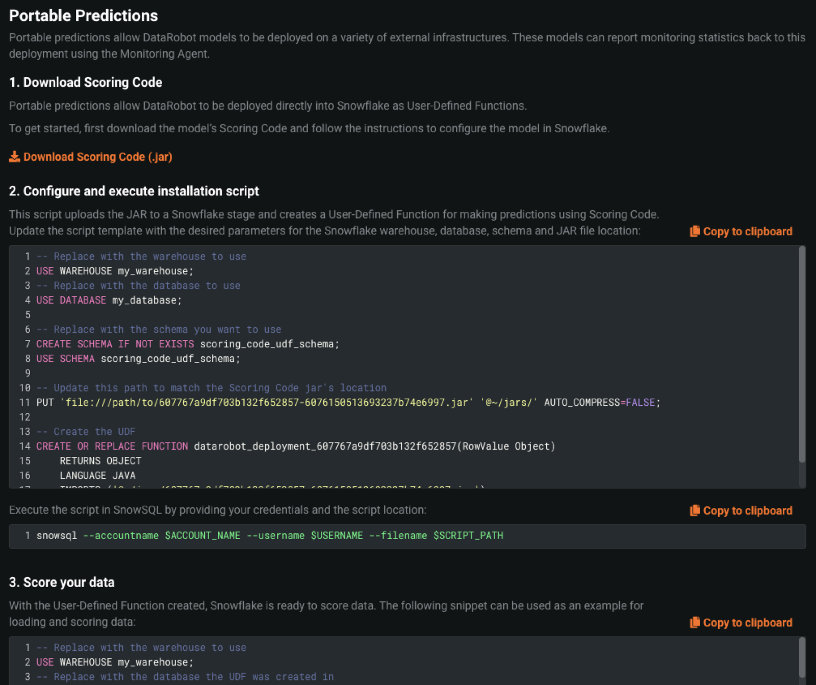 DataRobot Scoring Code now supports execution directly inside of Snowflake using Snowflake’s new Java UDF functionality. This capability removes the need to extract and load data from Snowflake, resulting in a much faster route to scoring large datasets. The Portable Predictions tab for deployments has been tailored to enable this functionality when the deployment is created in a Snowflake prediction environment.