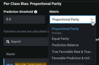The second improvement is the ability to view multiple fairness metrics in the Per-Class Bias page. This functionality allows you to view fairness scores for all five fairness metrics using a dropdown menu.