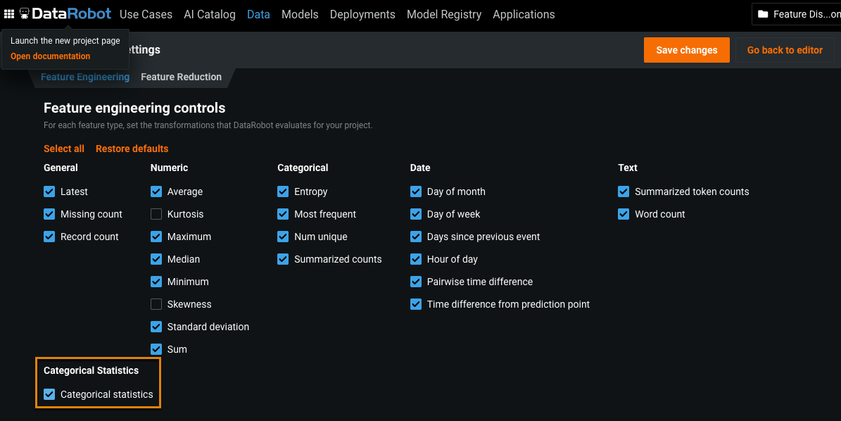 Categorical Statistics aggregation is turned off by default. You can enable it on the Feature Engineering tab of the Feature Discovery Settings page. For details, see Categorical Statistics.