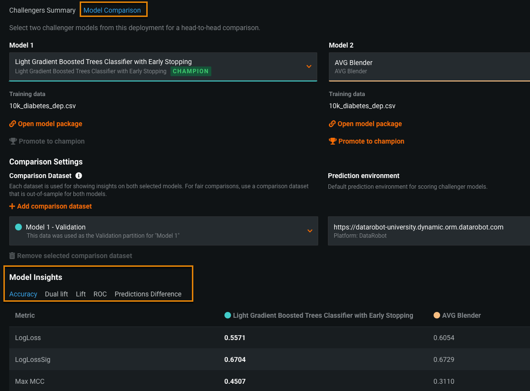If the challenger outperforms the current champion, you can promote the challenger to champion directly from the Model Comparison page.