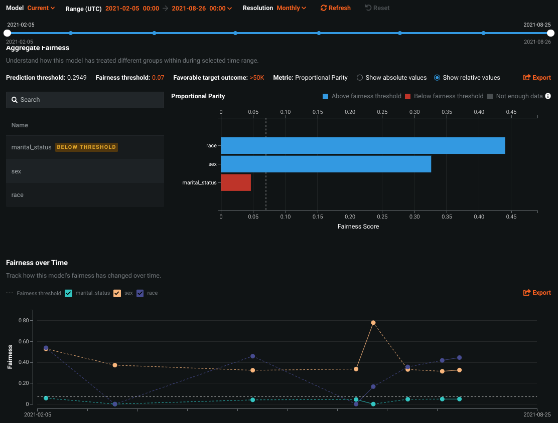 Per-Class Bias users the fairness threshold and fairness score of each class to determine if certain classes are experiencing bias in the model's predictive behavior. Fairness Over Time illustrates how the distribution of a protected feature's fairness scores have changed over time.