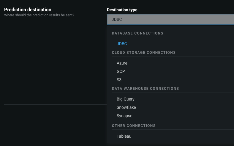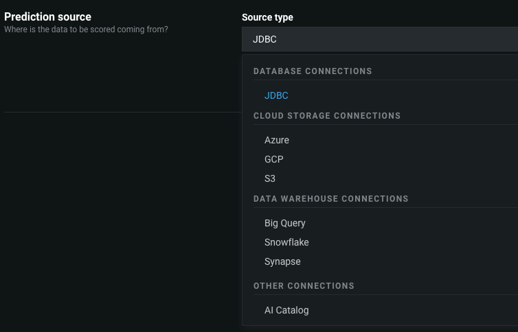 When creating a prediction job, you can now select BigQuery as a Prediction source and a Prediction destination on the Deployments page. You can also now select the AI Catalog as a Prediction source. Following are the supported prediction source and destination types: