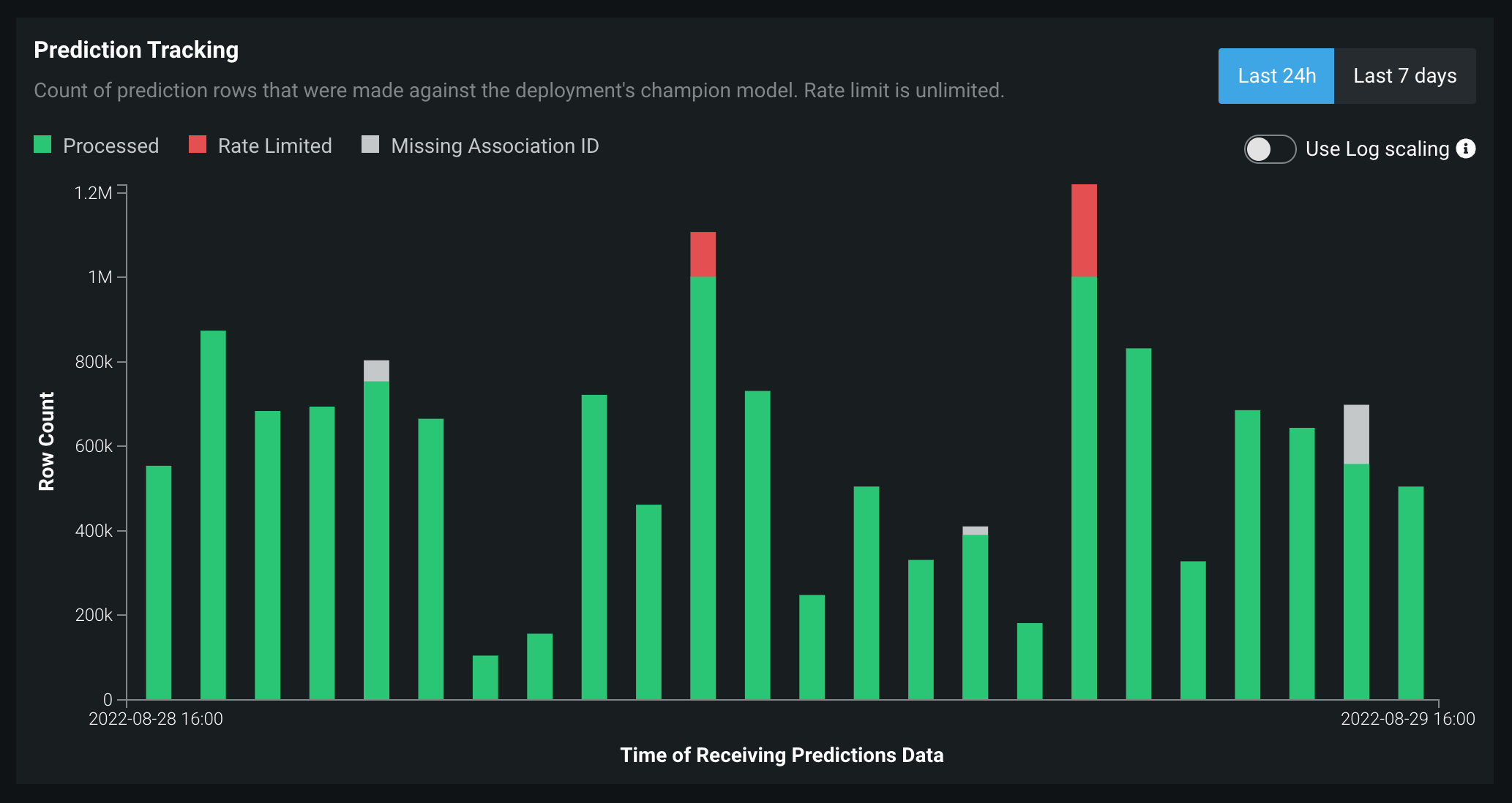 Now generally available, the Usage tab reports on prediction data processing for the Data Drift and Accuracy tabs. Monitoring a deployed model’s data drift and accuracy is a critical task to ensure that model remains effective; however, it requires processing large amounts of prediction data and can be subject to delays or rate limiting. The information on the Usage tab can help your organization identify these data processing issues. The Prediction Tracking chart, a bar chart of the prediction processing status over the last 24 hours or 7 days, tracks the number of processed, rate-limited, and missing association ID prediction rows: