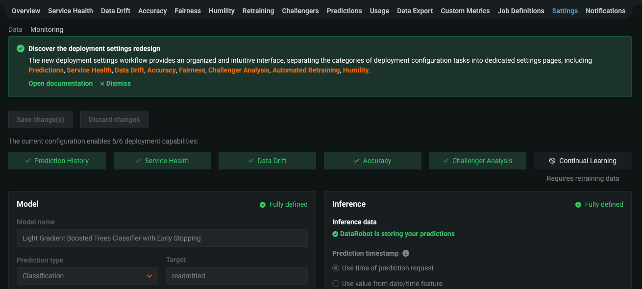 Now generally available, the redesigned deployment creation workflow provides a better organized and more intuitive interface. Regardless of where you create a new deployment (the Leaderboard, the Model Registry, or the Deployments inventory), you are directed to this new workflow. The new design clearly outlines the capabilities of your current deployment based on the data provided, grouping the settings and capabilities logically and providing immediate confirmation when you enable a capability, or guidance when you’re missing required fields or settings. A new sidebar provides details about the model being used to make predictions for your deployment, in addition to information about the deployment review policy, deployment billing details (depending on your organization settings), and a link to the deployment information documentation.
