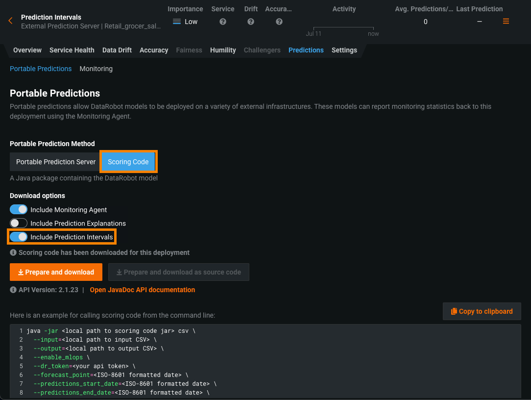 You can now include prediction intervals in the downloaded Scoring Code JAR for a time series model. You can download Scoring Code with prediction intervals from the Leaderboard or from a deployment.