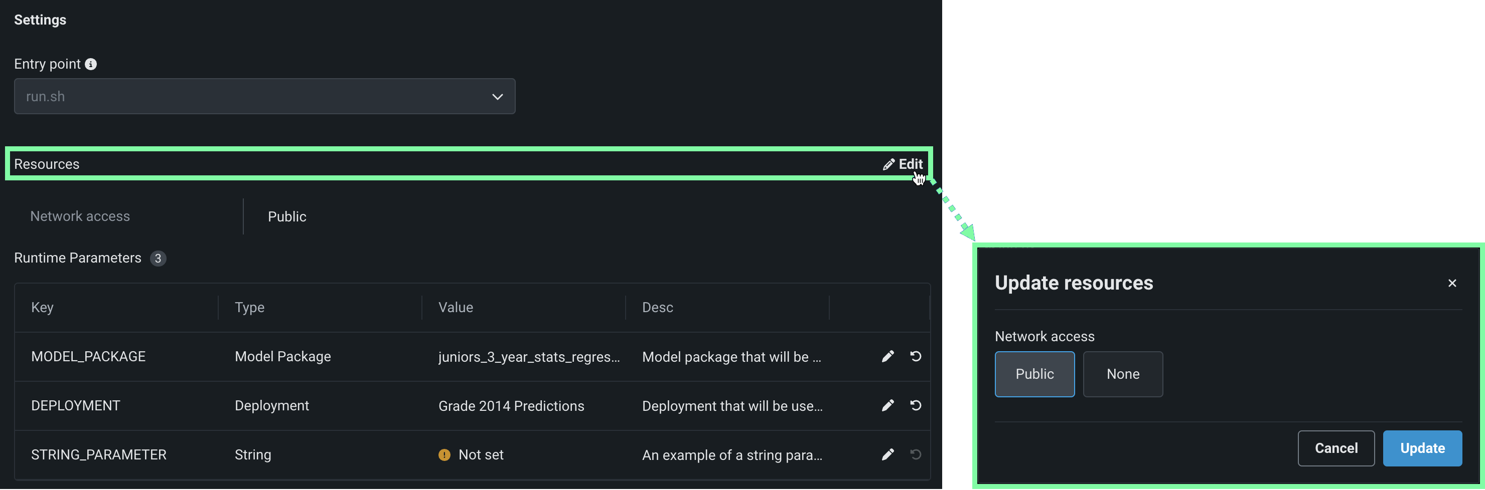 For the Managed AI Platform, the Network access setting is set to Public by default and the setting is configurable. For the Self-Managed AI Platform, the Network access setting is set to None by default and the setting is restricted; however, an administrator can change this behavior during DataRobot platform configuration. Contact your DataRobot representative or administrator for more information.