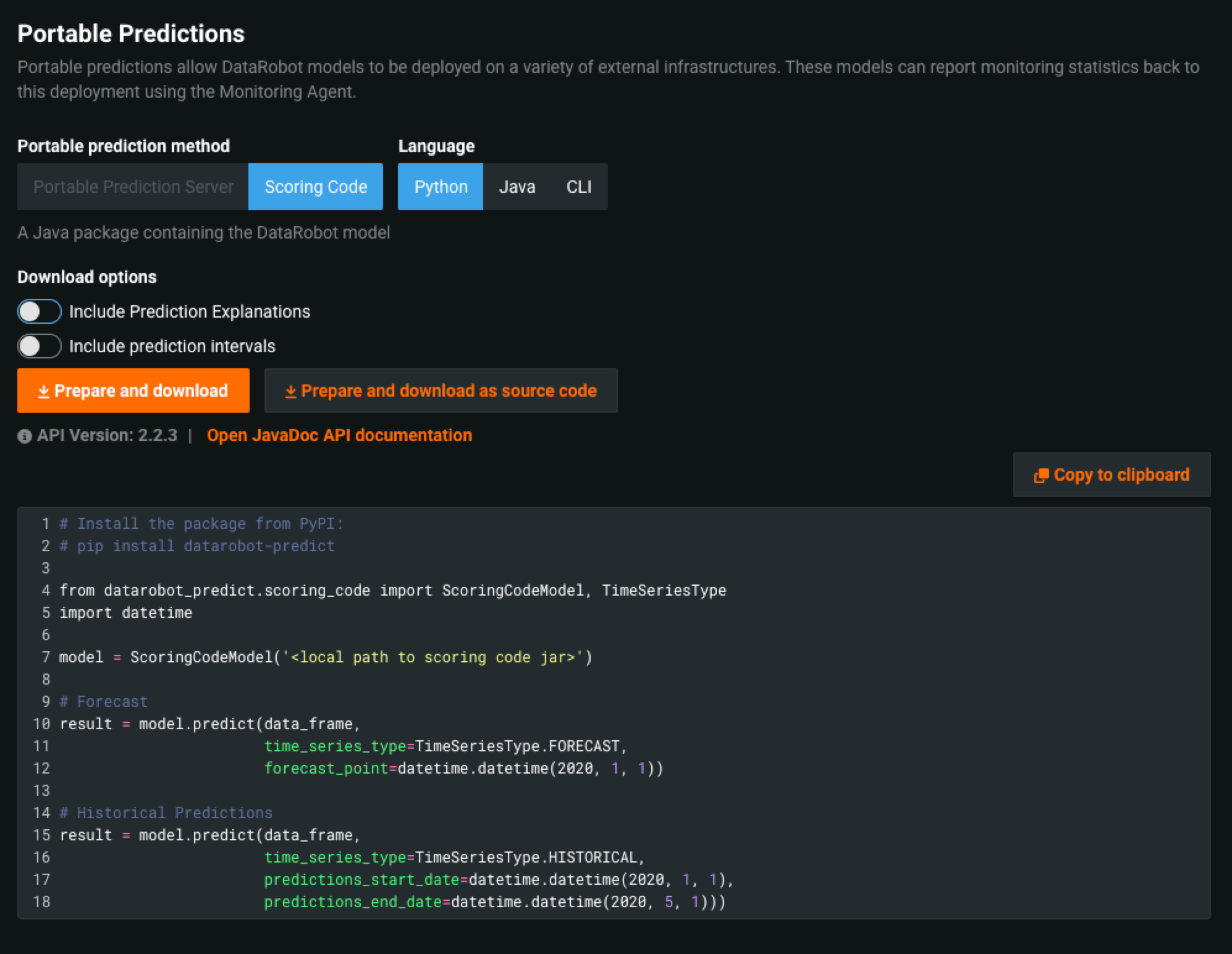 Now generally available, DataRobot allows you to use Scoring Code via Python and Java. Although the underlying Scoringe Code is based off Java, DataRobot now provides the DataRobot Prediction Library to make predictions using various prediction methods supported by DataRobot via a Python API. The library provides a common interface for making predictions, making it easy to swap out any underlying implementation. Access Scoring Code for Python and Java from a model in the Leaderboard or from a deployed model that supports Scoring Code.
