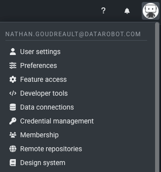 As part of DataRobot NextGen, DataRobot has updated the interface for user settings, including data connection and developer tools pages. Some settings have been renamed and the configuration pages have been repainted. To view the updated settings, select your user icon and browse the settings in the menu.