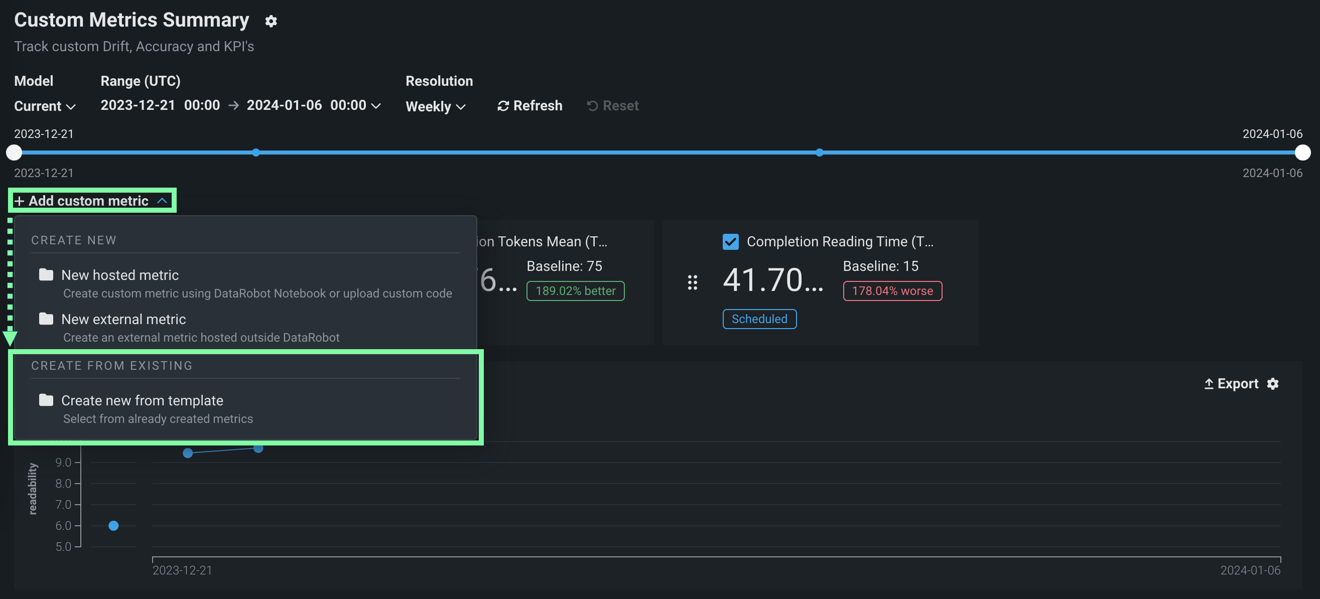 In the NextGen Console, on a deployment's Custom Metrics tab, you can compute and monitor up to five hosted custom metrics. Now available for preview, the custom metrics gallery provides a centralized library containing pre-made, reusable, and shareable code implementing a variety of hosted custom metrics for predictive and generative models. Metrics from the gallery are recorded on the configurable Custom Metric Summary dashboard, alongside any external custom metrics, allowing you to implement your organization's specialized metrics to expand on the insights provided by DataRobot's built-in service health, data drift, and accuracy metrics.