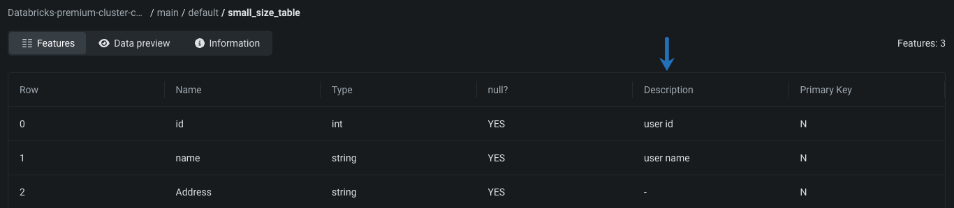 When connecting to Databricks in Workbench, you can now integrate with your data dictionary using the Description column in your datasets. To display this column in DataRobot, add and populate a Description column to your source data in Databricks.