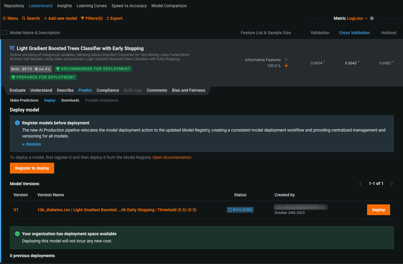 With this update, when you open a model on the Leaderboard and navigate to the Predict > Deploy tab, you are prompted to Register to deploy, providing model details and adding the model to the Model Registry as a new registered model, or as a new version of an existing model. Once the model is registered, you can click Deploy.