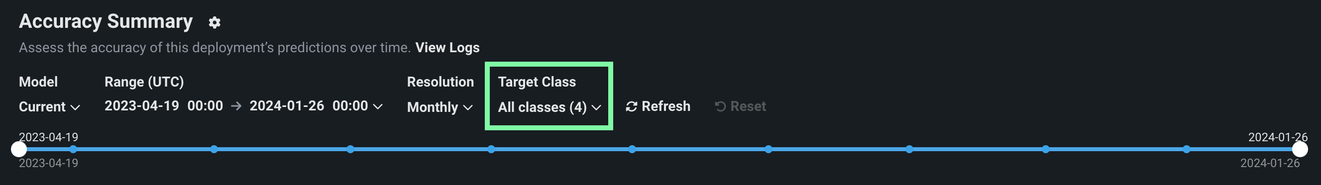 Multiclass deployments provide the same Accuracy over Time and Predicted vs Actual charts as standard deployments; however, the charts differ slightly as they include individual classes and offer class-based configuration to define the data displayed. In addition, you can choose between viewing the data as Charts or a Table: