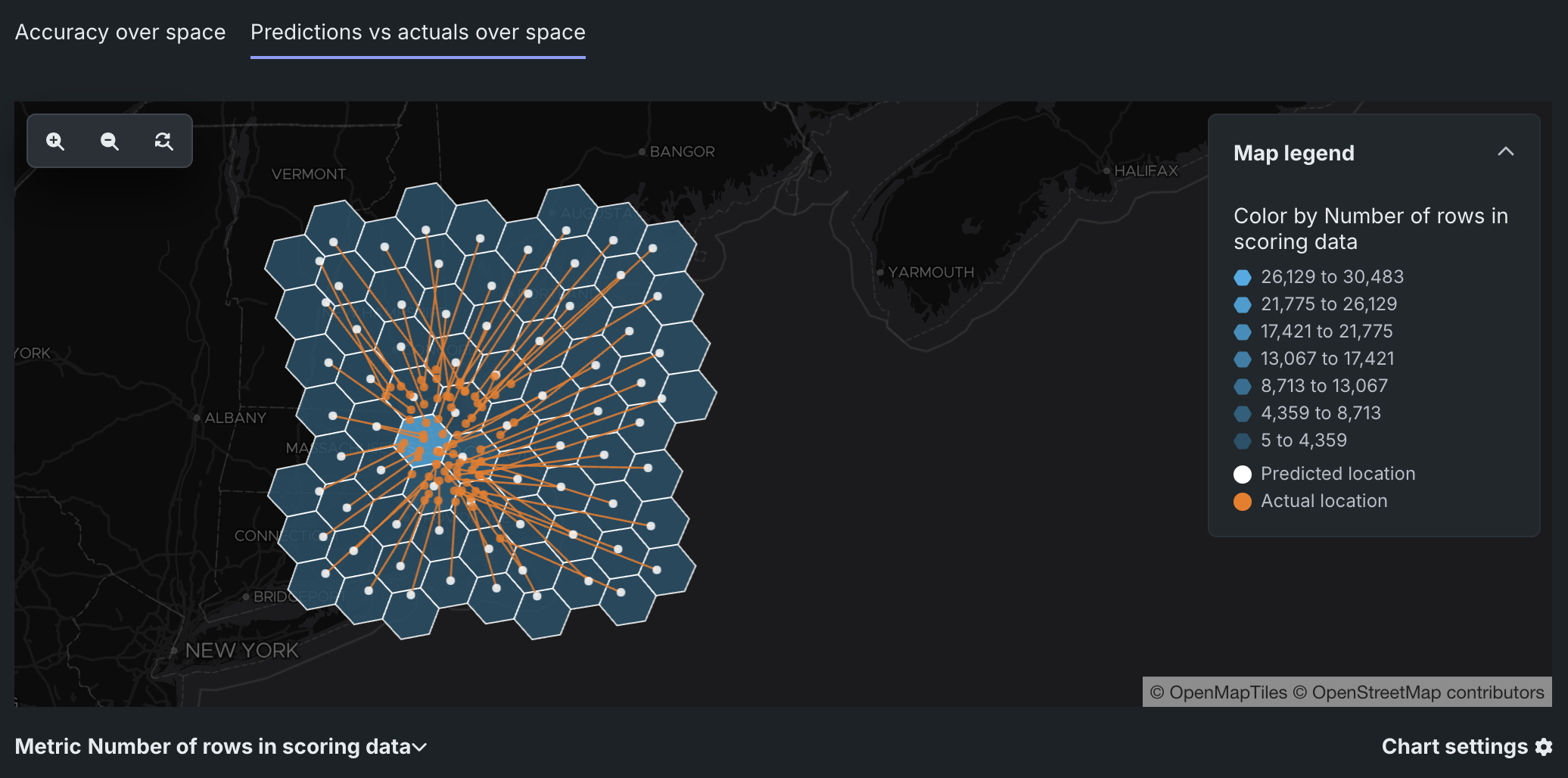 For deployed models with a location target type, the Over space tab includes the Predictions vs. actuals over space chart. In this chart, you can view a grid of H3 cells identifying the difference in scoring data sample size between locations or the difference in the number of rows with actuals between locations. For each cell, this chart plots the mean Predicted location and the corresponding mean Actual location, connected by a line, to provide a direct visualization of the accuracy represented by the WGS84 MAE and WGS84 RMSE metrics. The smaller the distance between the mean locations, the more accurate the model is.