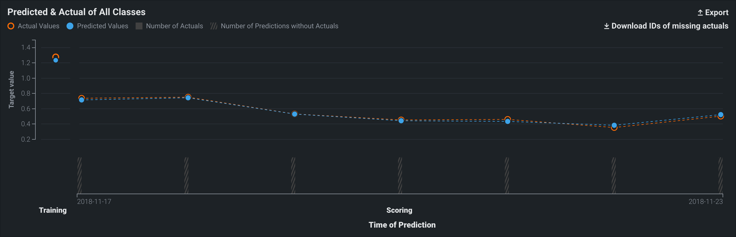 On the Time of Prediction axis (the x-axis), the volume bins display the number of actual values associated with the predictions made at each point. The light, shaded area represents the number of uploaded actuals; the striped area represents the number of predictions missing corresponding actuals: