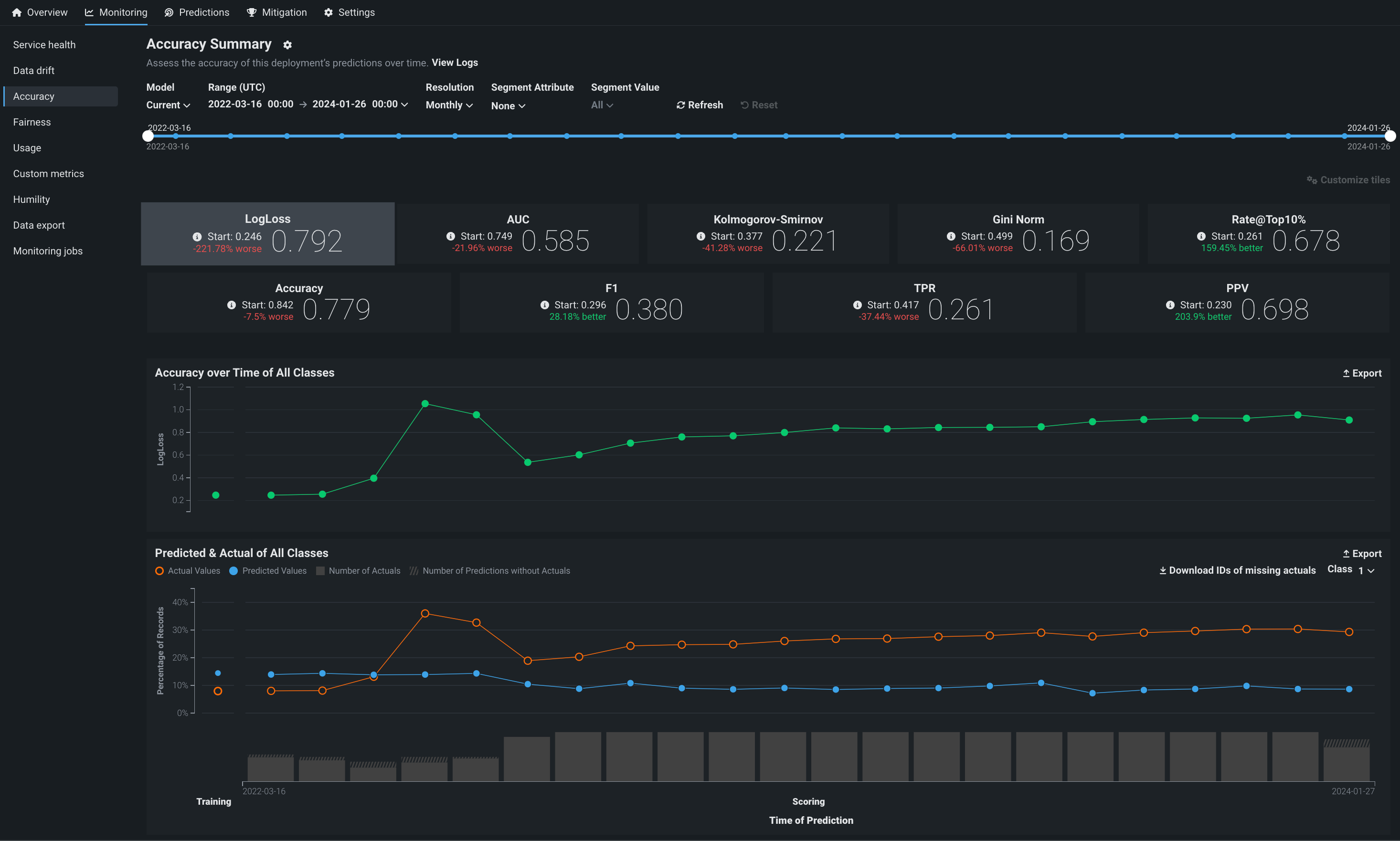 The Accuracy tab allows you to analyze the performance of model deployments over time using standard statistical measures and exportable visualizations. Use this tool to determine whether a model's quality is decaying and if you should consider replacing it. The Monitoring > Accuracy tab renders insights based on the problem type and its associated optimization metrics.
