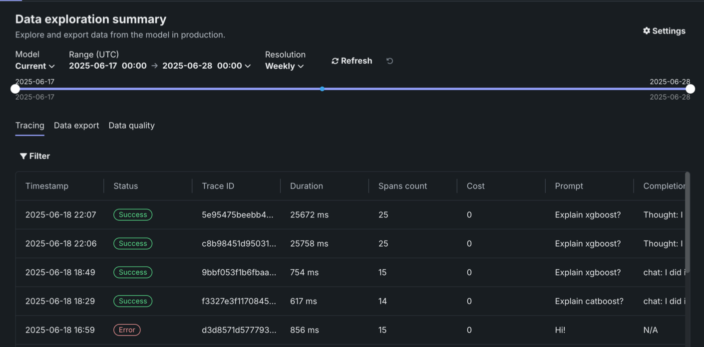 On the Data exploration tab of a custom or external model deployment, click Tracing to explore traces from the model or agentic workflow. Each trace—identified by a timestamp and a trace ID—contains a visual timeline that represents actions carried out by the model or agent, and revealing the order and duration of these actions.