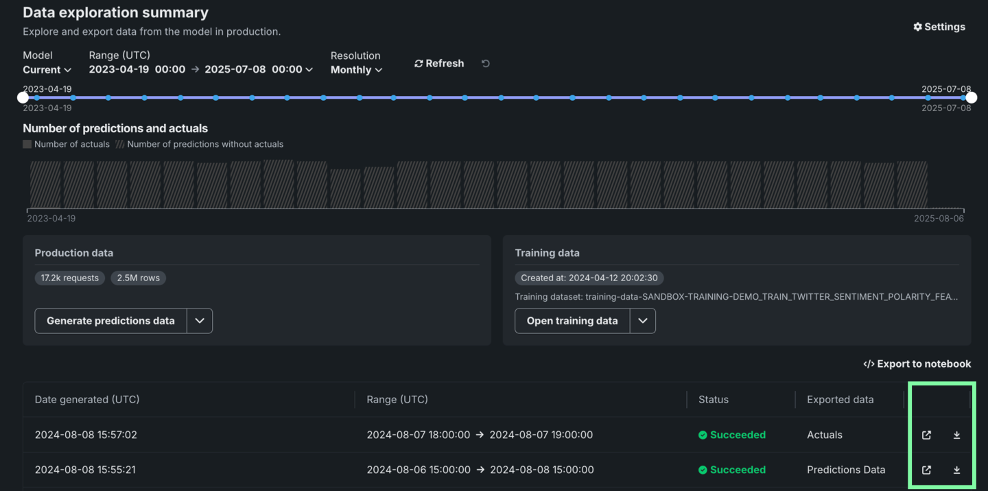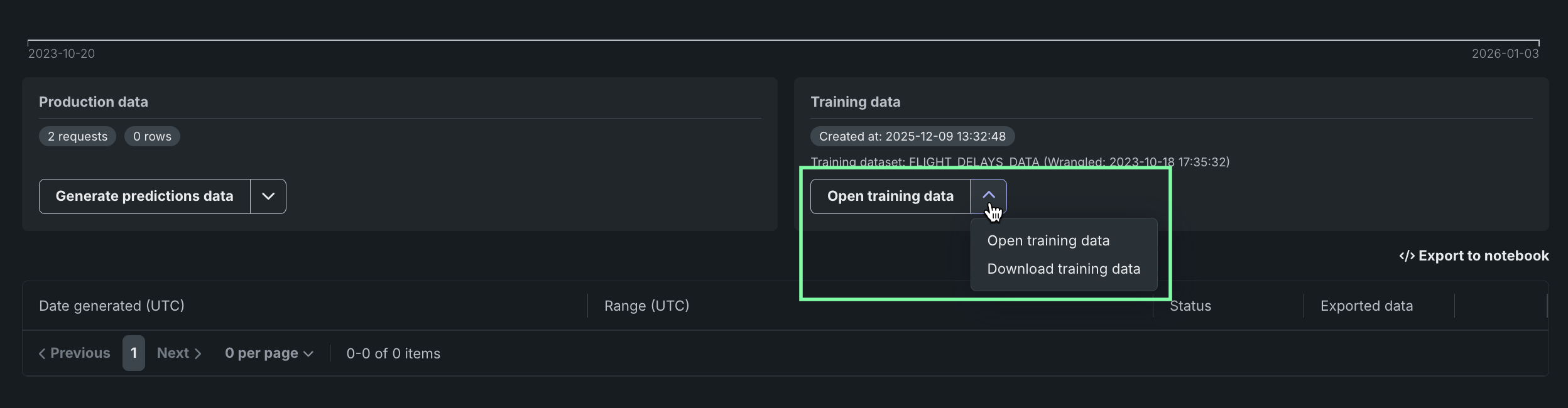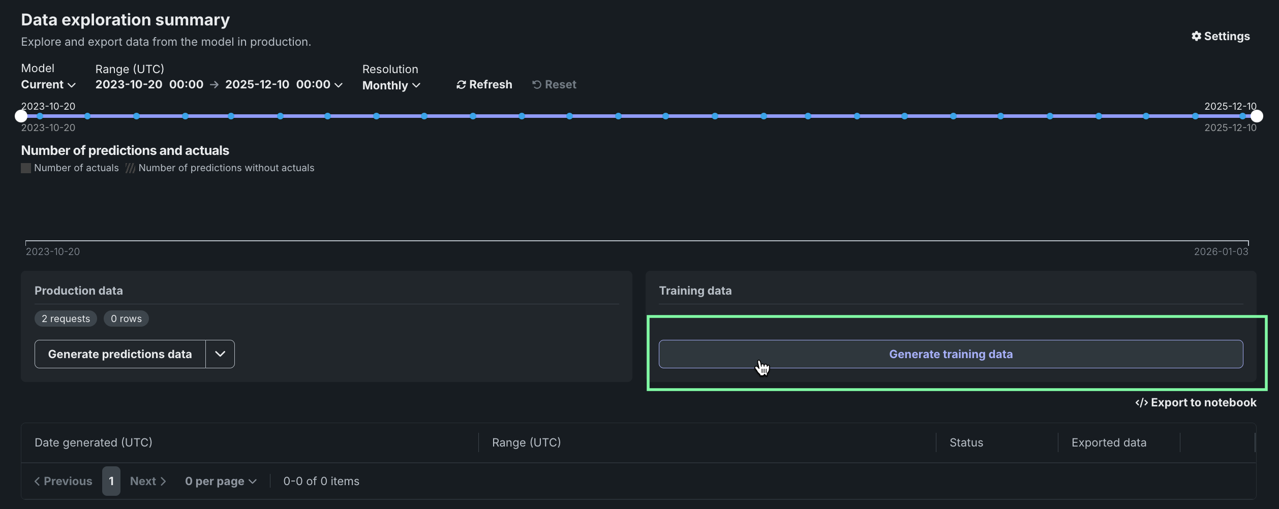 To access deployment data export for training data, on the Data exploration summary page, locate the Training data panel and click Generate training data to generate data for the specified model and time range: