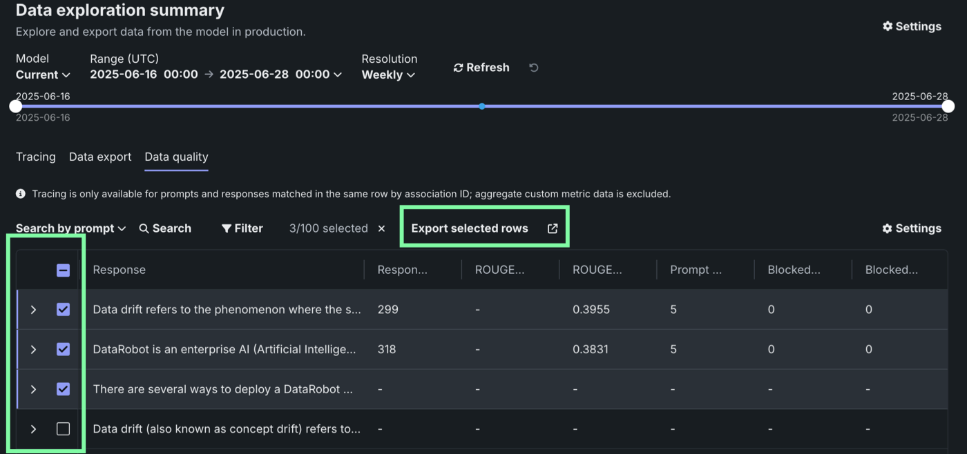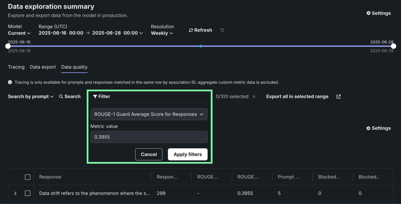 On the Data exploration tab of a generative AI deployment, click Data quality to explore prompts and responses alongside user ratings and custom metrics, if implemented, providing insight into the quality of the generative AI model. Prompts, responses, and any available metrics are matched by association ID: