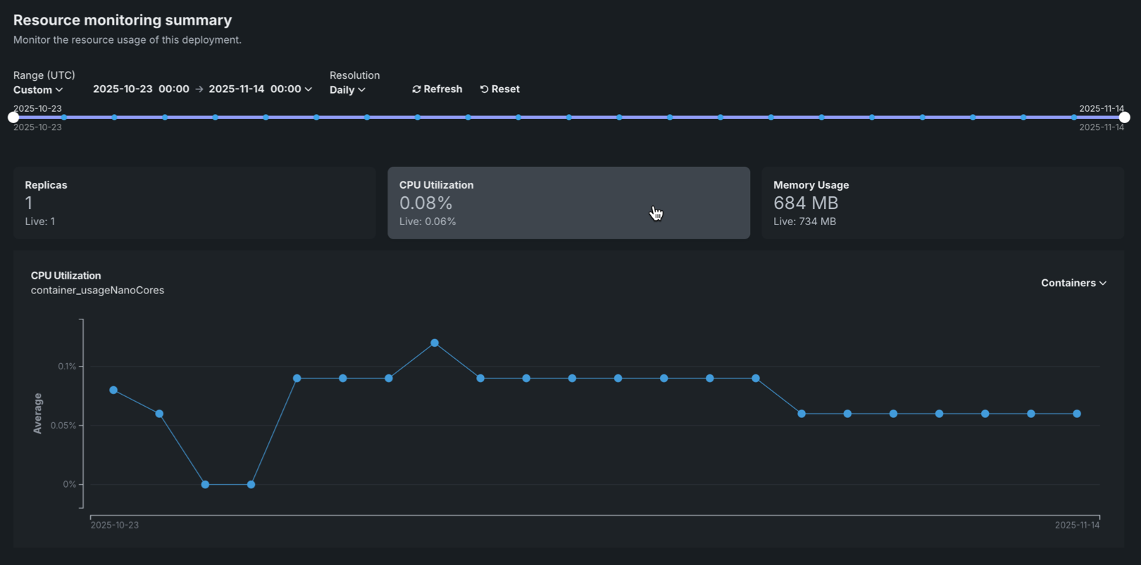 The Monitoring > Resource monitoring tab provides visibility into resource utilization metrics for deployed custom models and agentic workflows, helping you monitor performance, identify bottlenecks, and understand auto-scaling behavior. Use this tab to evaluate resource usage, navigate tradeoffs between speed and cost, and ensure your deployments efficiently utilize available hardware resources.