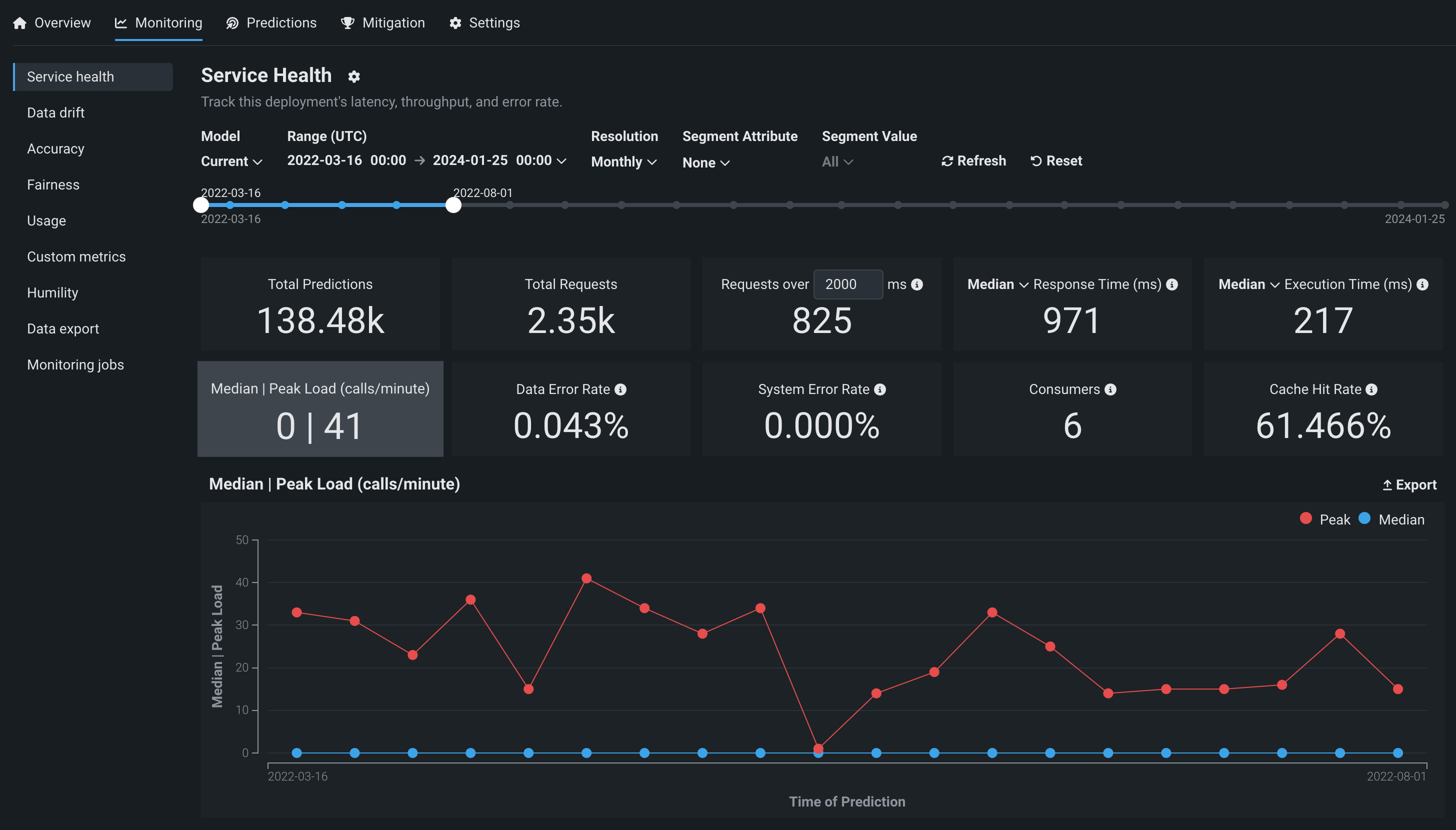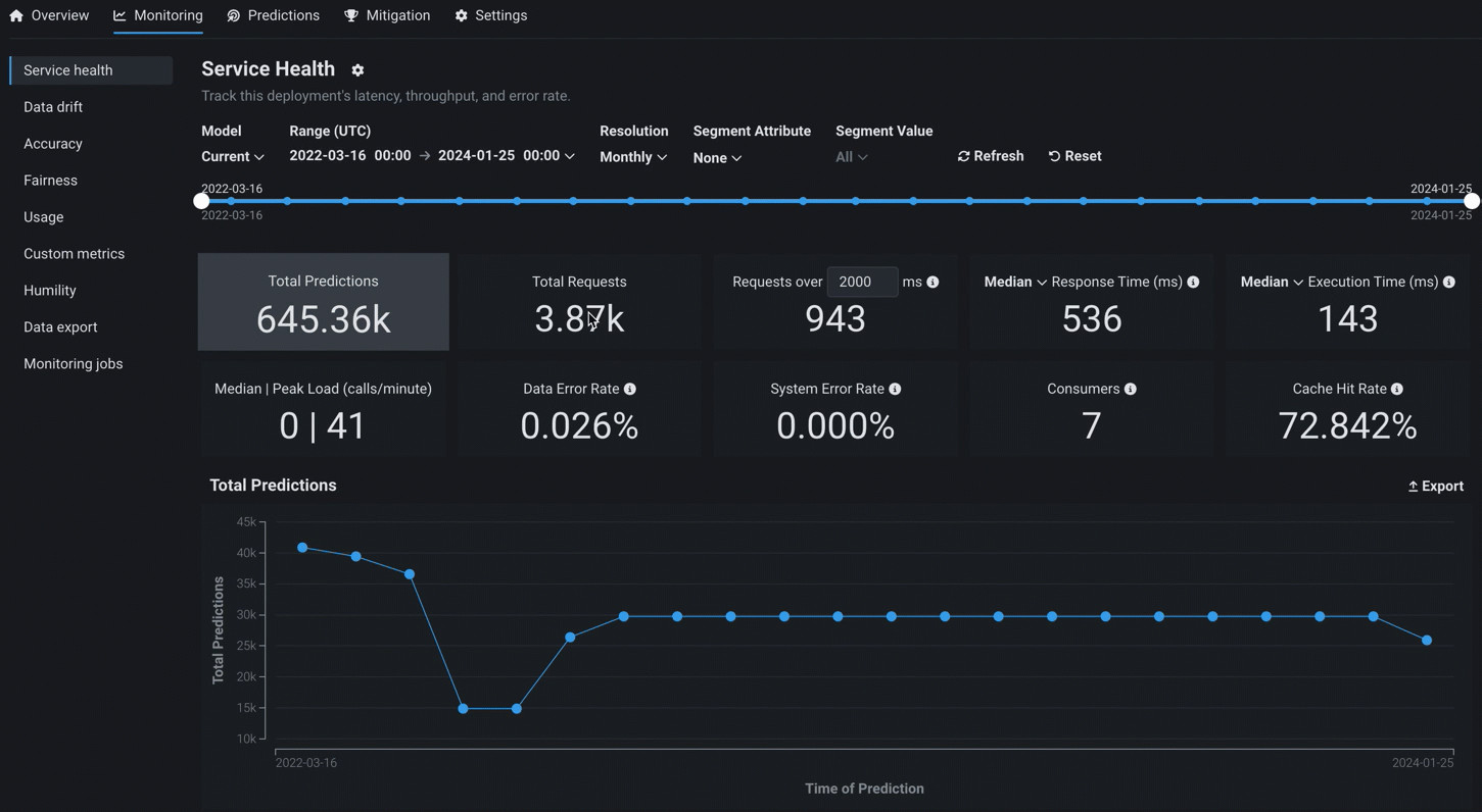 The Service health tab tracks metrics about a deployment's ability to respond to prediction requests quickly and reliably. This helps identify bottlenecks and assess capacity, which is critical to proper provisioning. For example, if a model seems to have generally slowed in its response times, the Service health tab for the model's deployment can help. You might notice in the tab that median latency goes up with an increase in prediction requests. If latency increases when a new model is switched in, you can consult with your team to determine whether the new model can instead be replaced with one offering better performance.