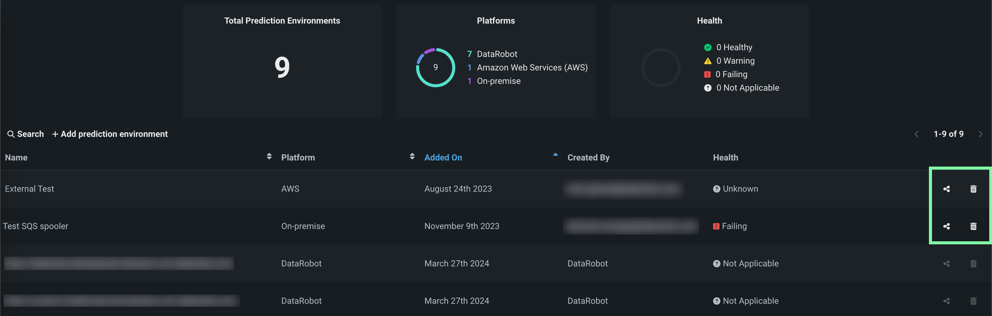 From the Prediction environments page, the sharing capability allows appropriate user roles to grant permissions for prediction environments to others. In addition, you can delete prediction environments with the appropriate permissions.