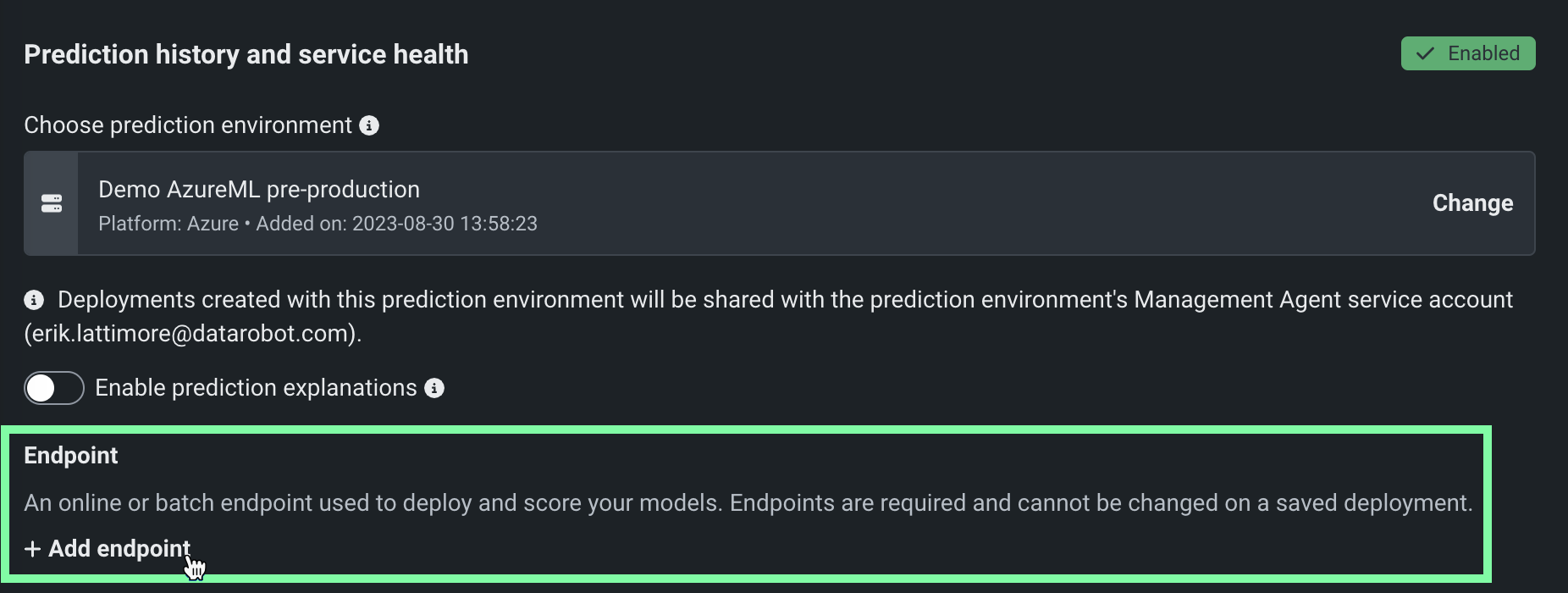 6. With an AzureML environment selected, in the Prediction history and service health section, under Endpoint, click + Add endpoint.