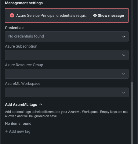 3. In the Management settings section, select the related Azure service principal Credentials. Configure the Azure Subscription, Azure Resource Group, and AzureML Workspace fields accessible using the provided Credentials.