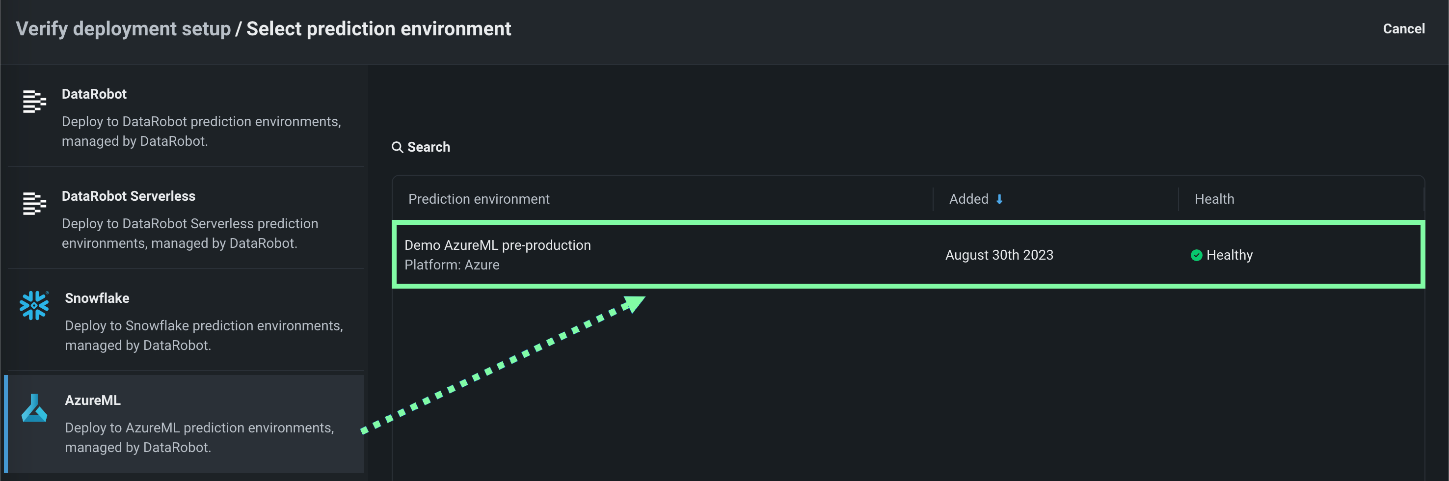 5. In the Select prediction environment panel, click AzureML, and then click the prediction environment you want to deploy to.