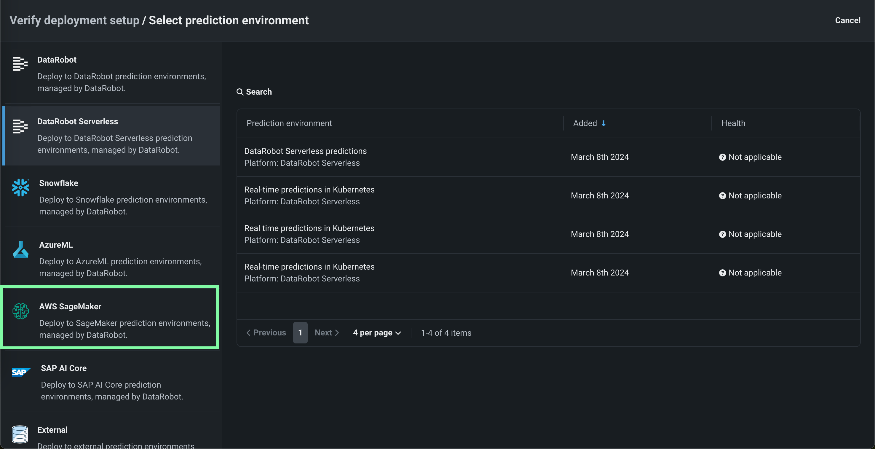 In the Select prediction environment panel, click AWS Sagemaker, and then click the prediction environment you want to deploy to.