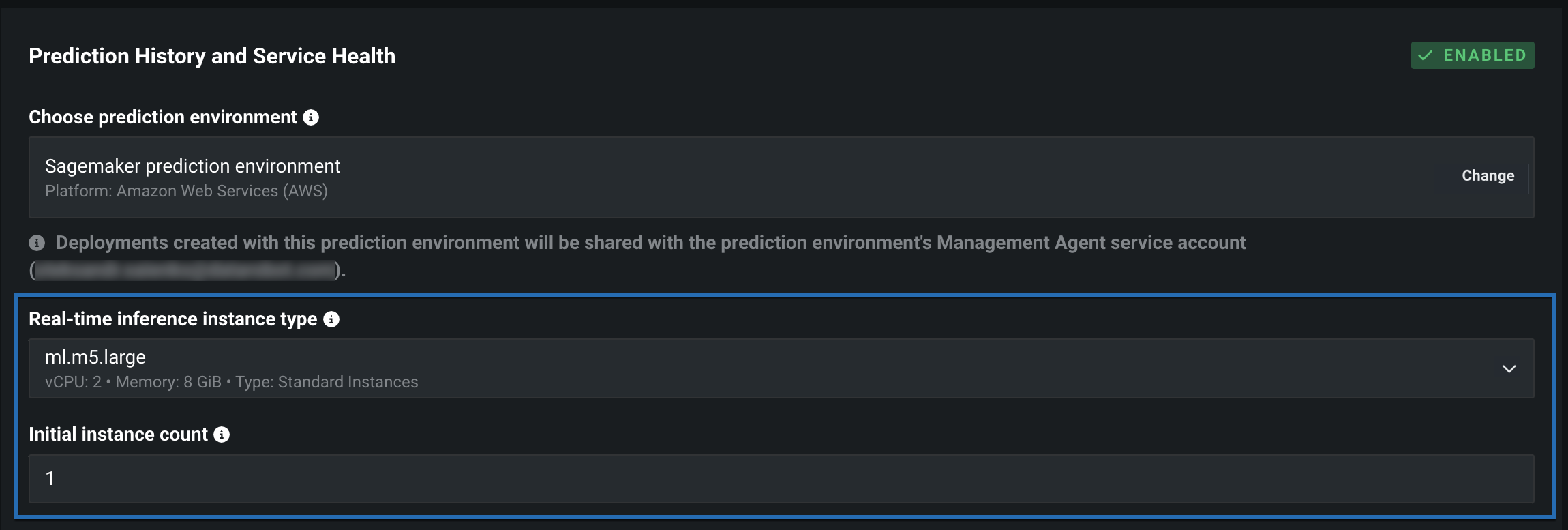 With a Sagemaker environment selected, in the Prediction history and service health section, set the Real-time inference instance type and Initial instance count fields.