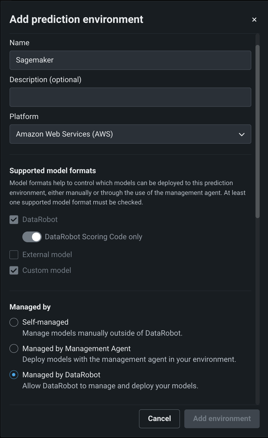 Select the Managed by DataRobot option to allow this prediction environment to automatically package and deploy DataRobot custom and Scoring Code models through the Management Agent.