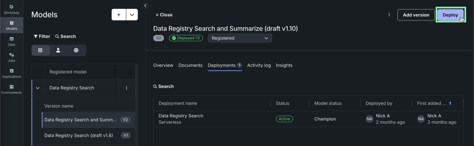 On the Registry > Models tab, in the table of registered models, click the registered model containing the version you want to deploy, opening the list of versions.