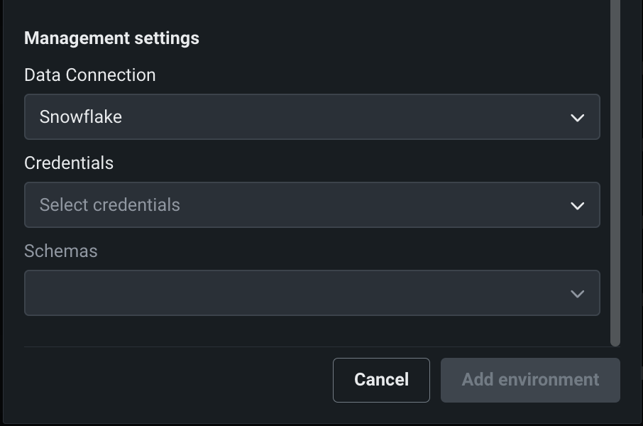 In the Management settings section, select a Data Connection and the related Credentials, and then select the Snowflake Schemas. Snowflake schemas are collections of Snowflake tables.