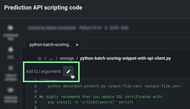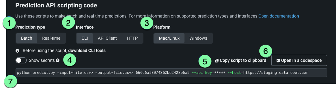 • CLI: A standalone batch prediction script using the DataRobot API client. Before using the CLI script, if you haven't already downloaded predict.py, click download CLI tools.
