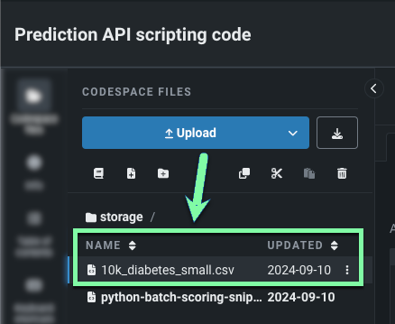 The codespace allows for full access to file storage. You can use the Upload button to add additional datasets for scoring, and have the prediction output (output.json, output.csv, etc.) return to the codespace file directory after executing the snippet. This example uploads 10k_diabetes_small.csv to the codespace as an input file.