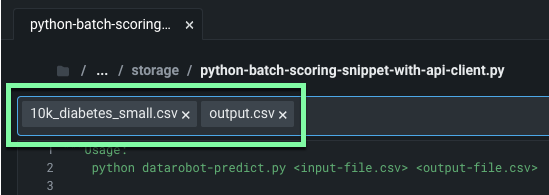This example references 10k_diabetes_small.csv as the input file for scoring, and names the output file output.csv.