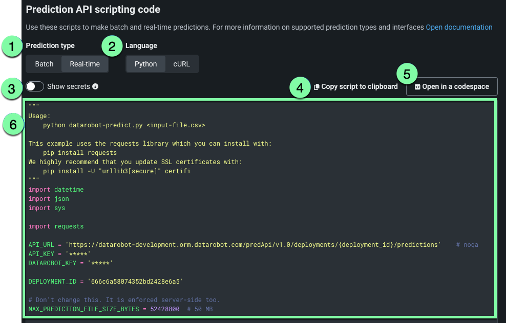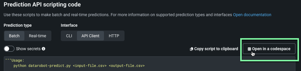 4 Show secrets Displays any secrets hidden by ***** in the code snippet. Revealing the secrets in a code snippet can provide a convenient way to retrieve your API key or datarobot-key; however, these secrets are hidden by default for security reasons, so ensure that you handle them carefully.