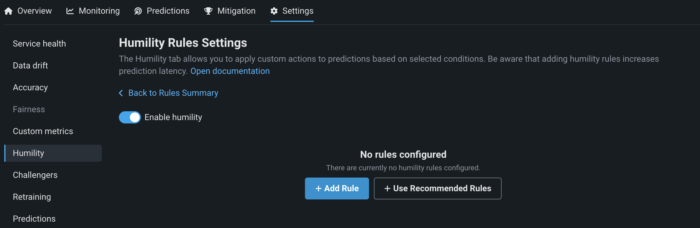 On the Humility Rules Settings page, if you haven't enabled humility for a model, click the Enable humility toggle, then: