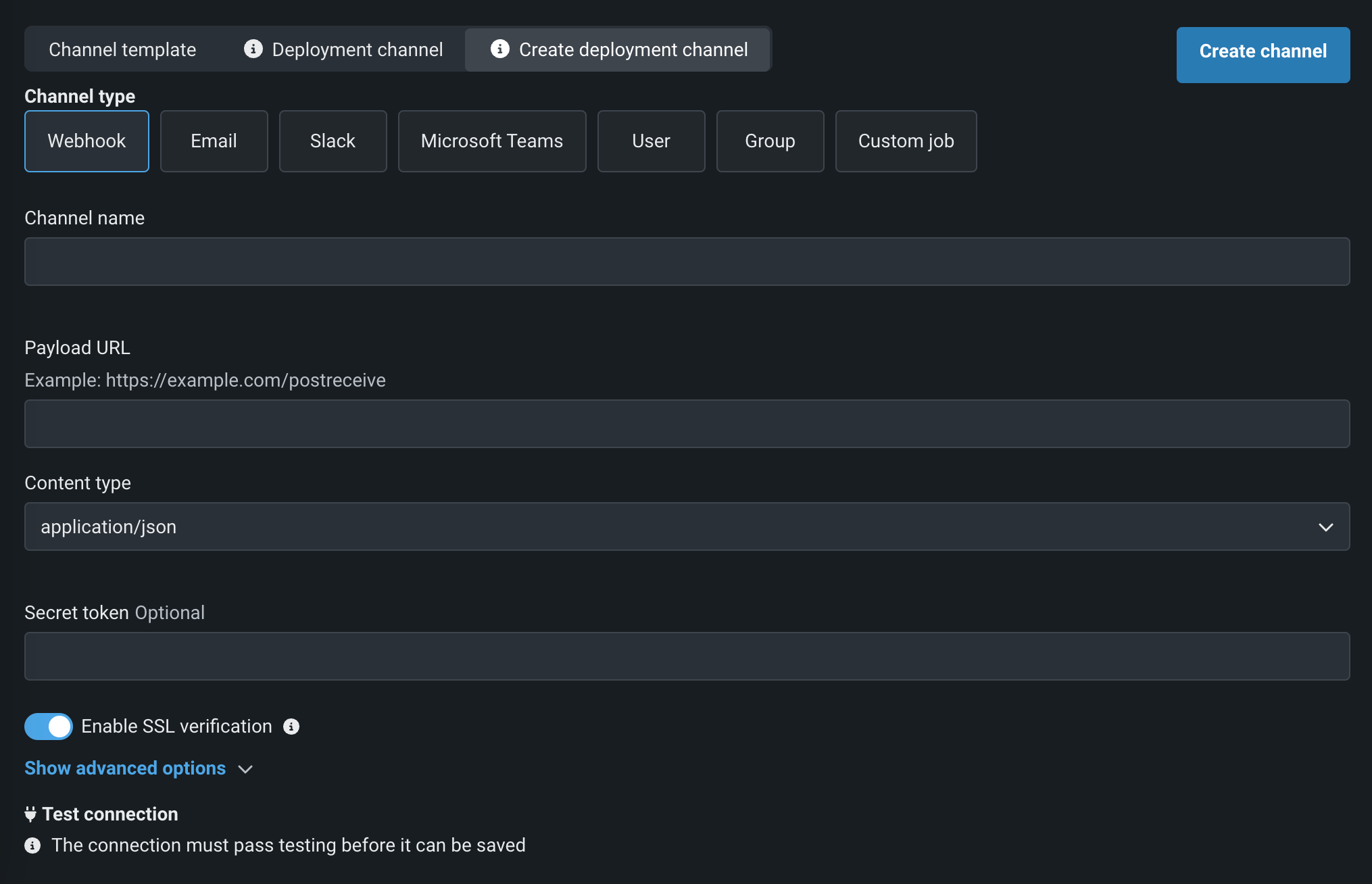 On the Select channel tab, select a Channel template or a custom Deployment channel. Alternatively, if you haven't configured an appropriate channel, click Create deployment channel, configure the following channel settings, and then click Create channel to add and select a new custom channel for the current deployment: