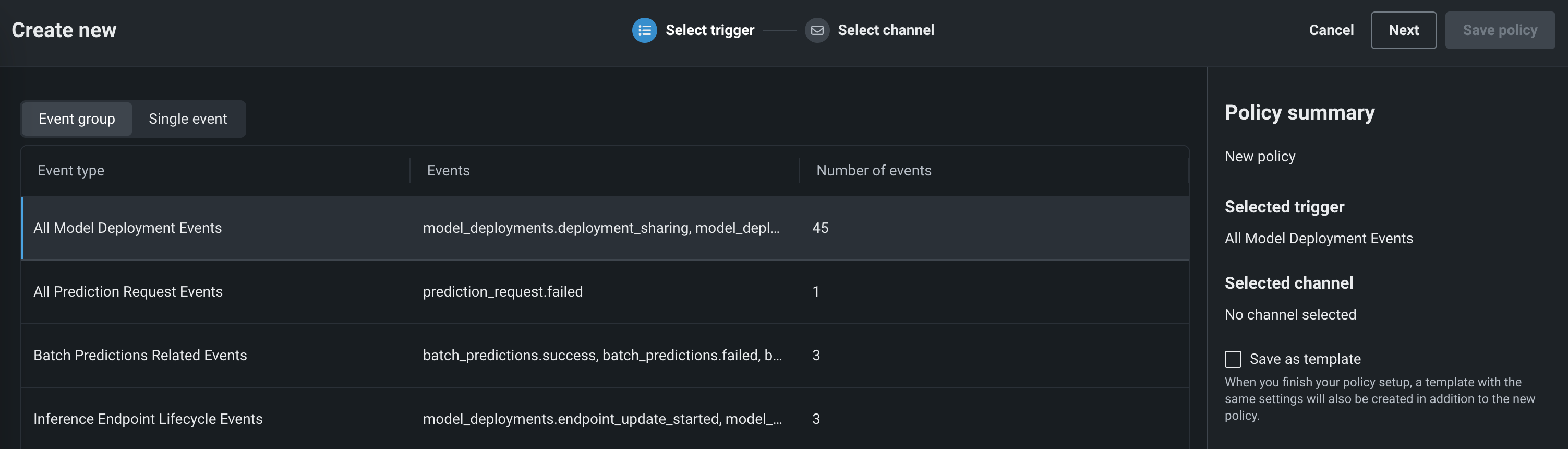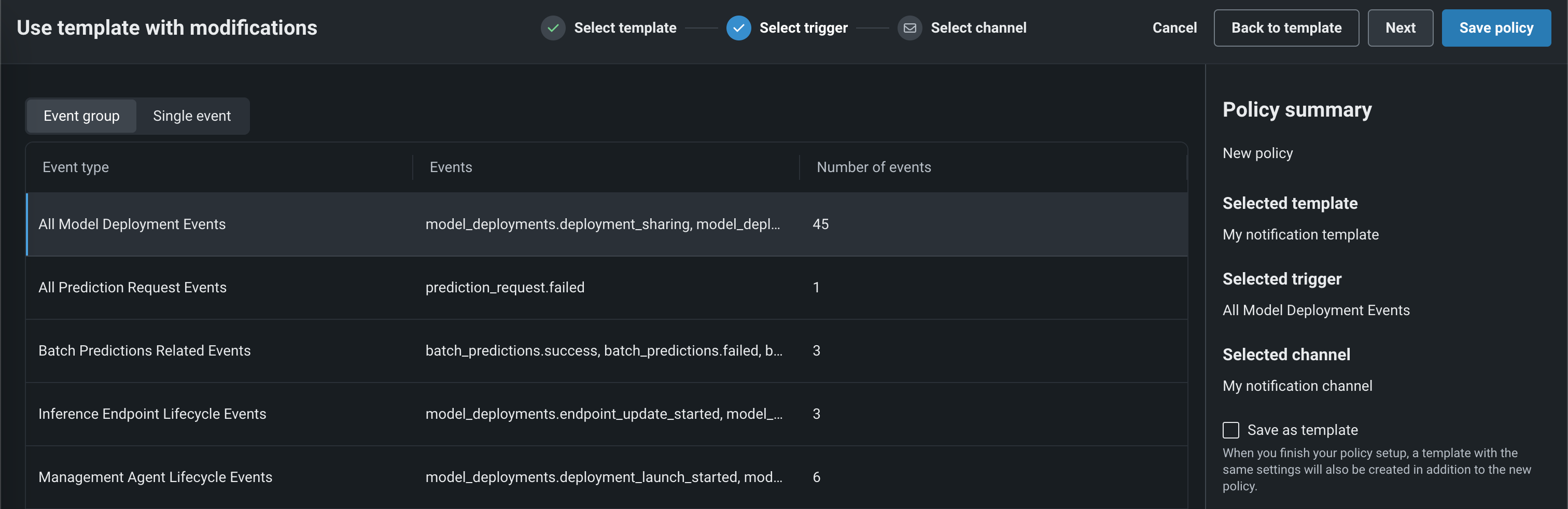 In the Use template with modifications panel, on the Select template tab, select a policy template, then click Next. On the Select trigger tab, select an Event group or a Single event and click Next: