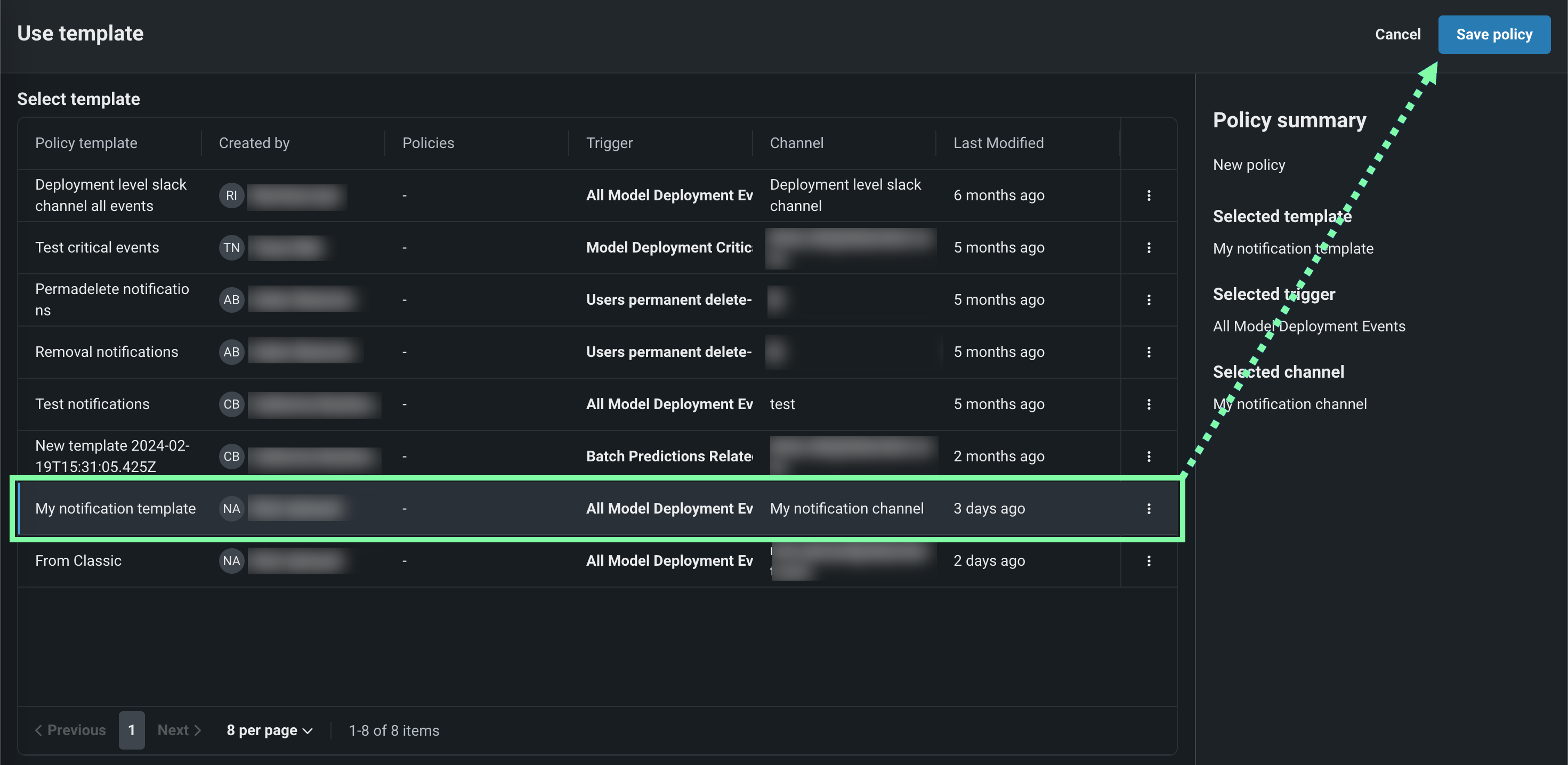 Click Save policy. The new policy appears in the table under Notification policies applied to this deployment.