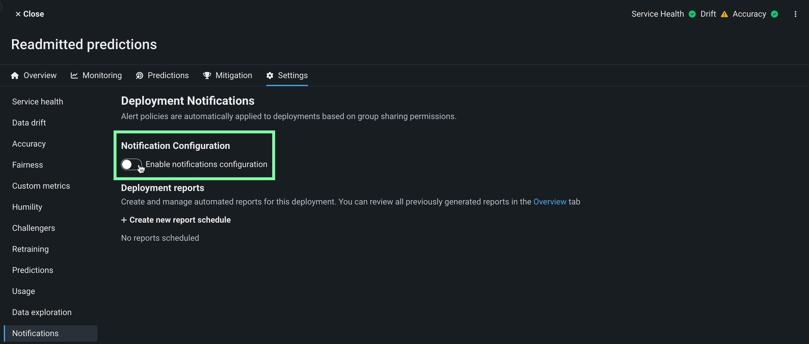 DataRobot provides automated monitoring with a configurable notification system, alerting you when service health, data drift status, model accuracy, or fairness values exceed your defined acceptable levels. Notifications can trigger in-app alerts, emails, and webhooks. They are off by default but can be enabled by a deployment owner. Keep in mind that notifications only control whether emails are sent to subscribers; if notifications are disabled, monitoring of service health, data drift, accuracy, and fairness statistics still occurs. By default, notifications occur in real time for your configured status alerts, allowing your organization to quickly respond to changes in model health without waiting for scheduled health status notifications; however, you can choose to send notifications on the monitoring schedule.