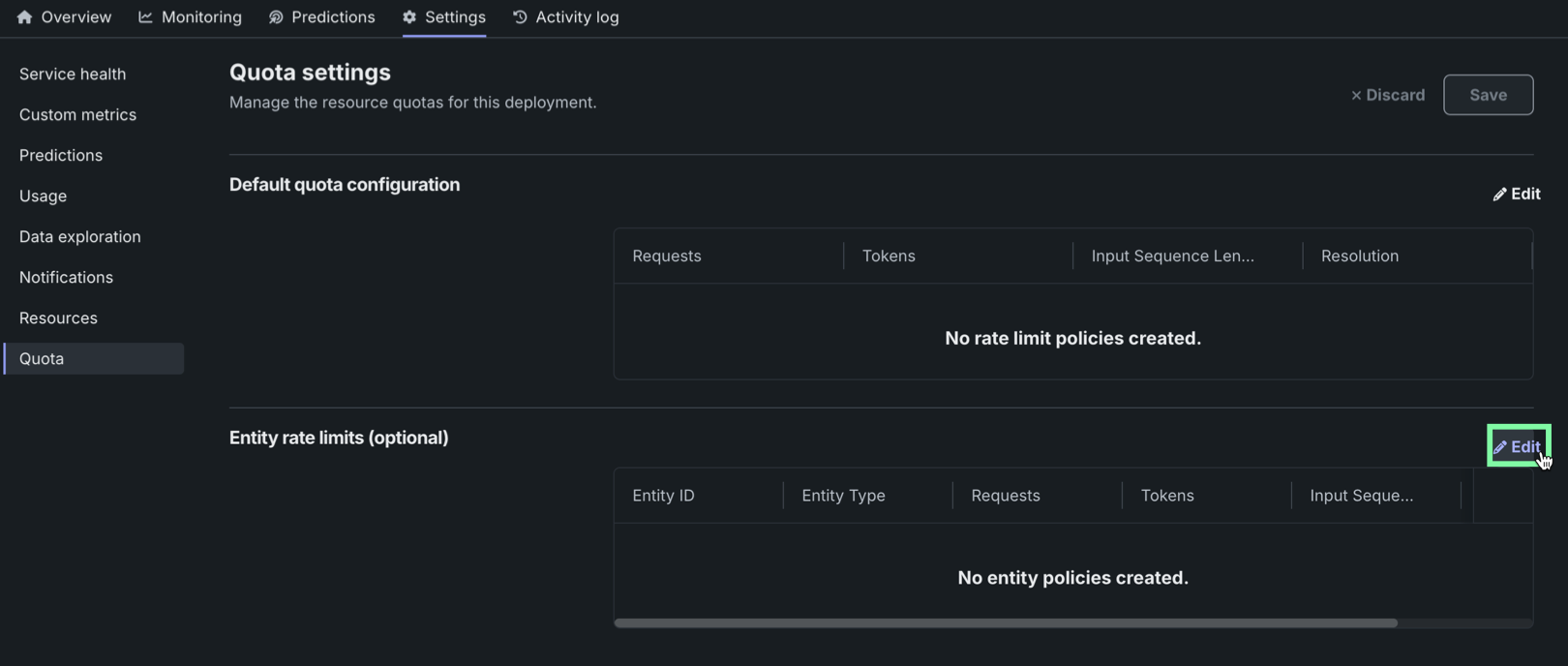 Click Edit to modify the entity-based quota settings for the deployment.