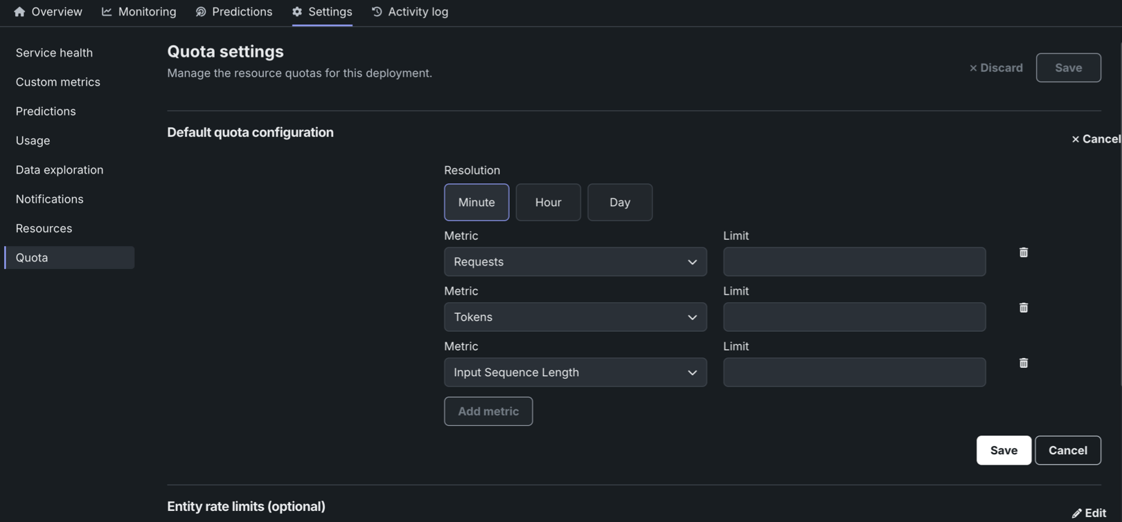 If a default quota configuration isn't set, click Add metric to begin configuration.