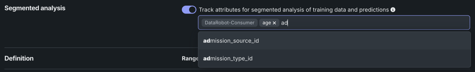 After enabling segmented analysis, specify the segment attributes to track in training and prediction data before making predictions. Selecting a segment attribute for tracking causes the model's data to be segmented by the attribute, allowing users to closely analyze the segment values that comprise the attributes selected for tracking. Attributes used for segmented analysis must be present in the training dataset for a deployed model, but they don't need to be features of the model. The list of segment attributes available for tracking is limited to categorical features, except the selected series ID used by multiseries deployments. To track an attribute, add it to the Track attributes for segmented analysis of training data and predictions field.