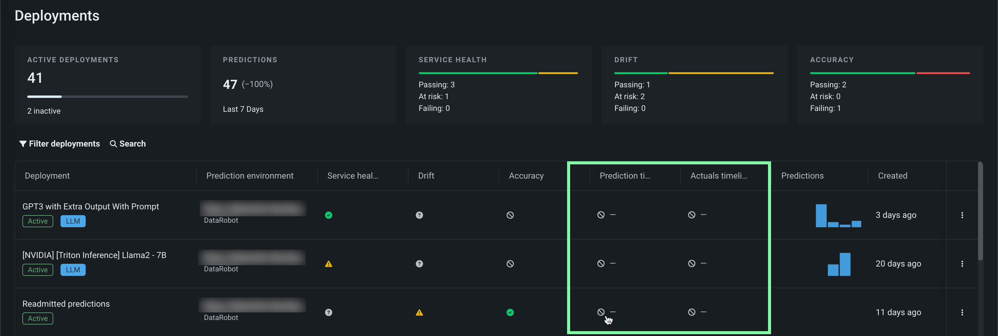 Click the Gray / Not Tracked icon in the Predictions timeliness or Actuals timeliness column to open the Usage settings page for that deployment.