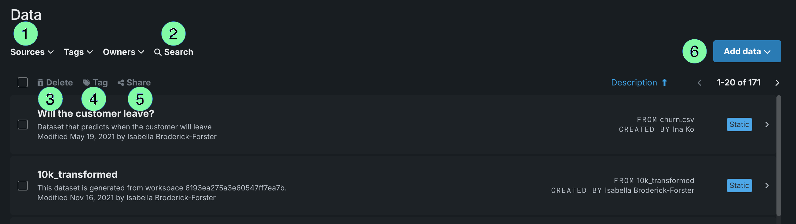| 1 | Filters | Filter your data assets by data source—local file, URL, data connection, or Spark;—, tags, and owners. |